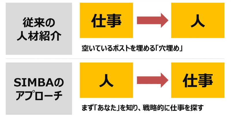 私たちSIMBAが、世の中にある多くの「人材紹介会社」や「転職エージェント」と何が違うのか。結論から言います。「矢印の向き」が逆なんです。通常の人材紹介は、「仕事➡人」です。企業の「空いているポスト」という穴があって、そこに合う人を埋める。 しかし、SIMBAは逆です。「人➡仕事」です。まず「皆さん」がどういう人間で、どう生きたいのか。そこからスタートして、それに合う仕事を私たちが探しに行きます。